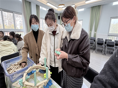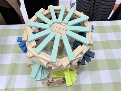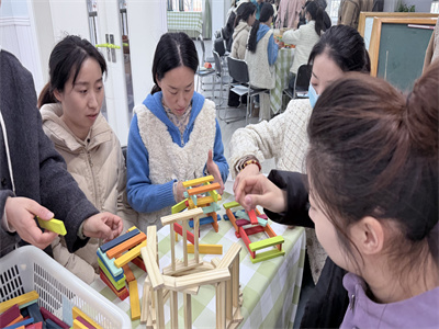 看似简单的积木,却富含复杂万端的玄妙变化。活动伊始,老师们按年级组分组,结合幼儿年龄特点,尝试搭建适合不同阶段幼儿的造型——从低龄段的 “简单桥梁、稳固塔台”,到高龄段的“联动装置、立体场景”,在亲身体验、实际操作中,在“尝试—发现问题—解决问题—再尝试”循环往复中,充分了解了阿基米德木块的特性,更加理解幼儿在搭建中的想法,对于如何有效地指导幼儿搭建有了方向。